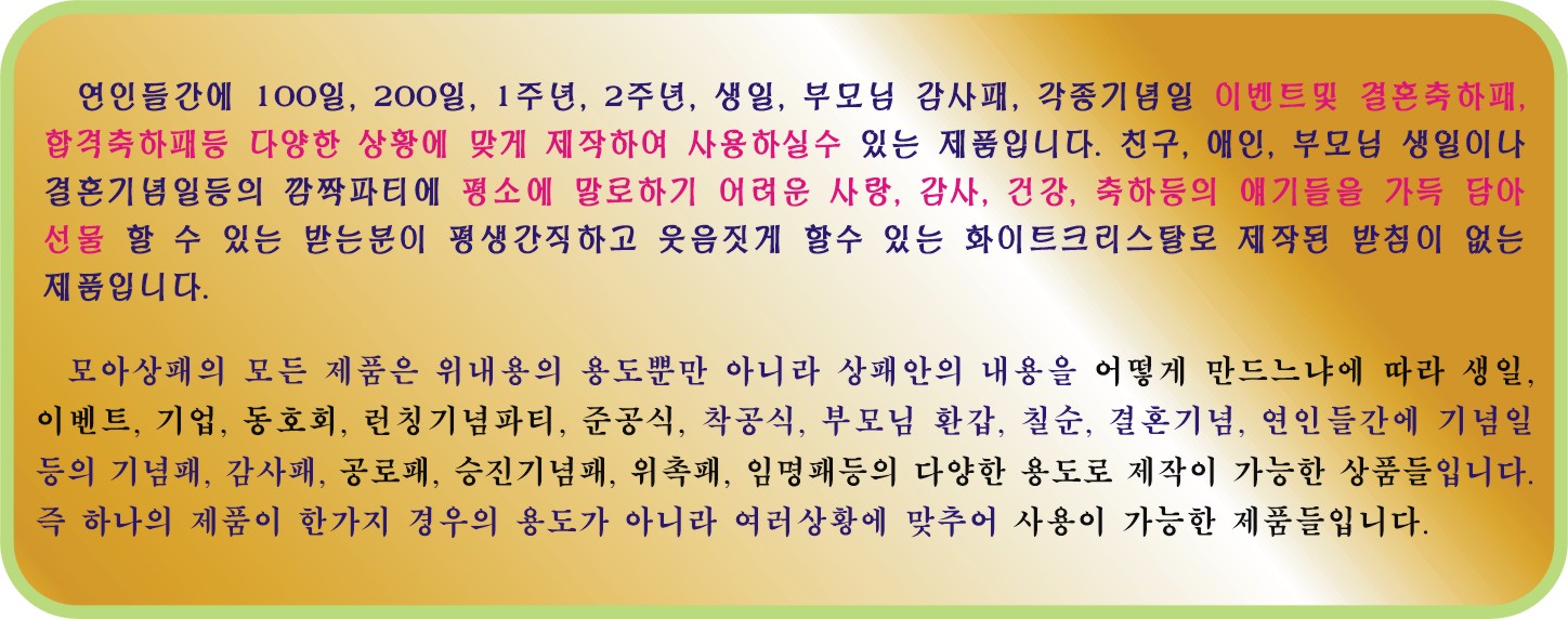 상패나 트로피는 행사용품이기 때문에 배송일이 저희 "모아상패"는 소비자 보호를 위한 제반 법규를 모두 준수하고 있습니다. 상품제작과정이나 배송중에 발생한 모든 제품의 하자에 대해서는 책임지고 A/S 또는 교환해 드립니다.
